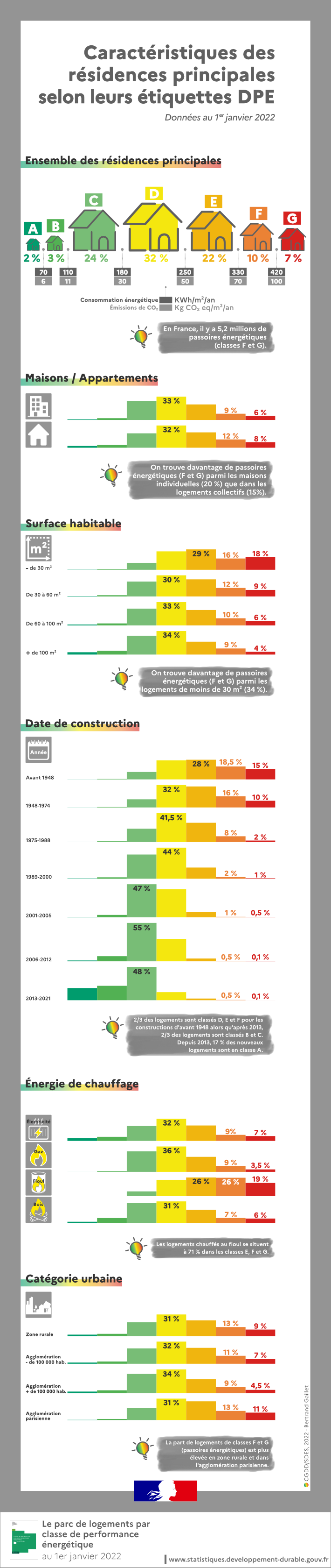 Ce document de travail actualise les chiffrages sur le parc de logements par classe de diagnostic de performance énergétique (DPE), dont le calcul a été modifié en juillet et octobre 2021 et tient désormais compte à la fois de la consommation primaire d’énergie et des émissions de gaz à effet de serre. Les étiquettes DPE sont estimées sur l’ensemble du parc de logements à partir de 310 000 observations des DPE, collectées par l’Ademe, sur la période de décembre 2021 à mars 2022 et des données fiscales. Au total, sur les 30 millions de résidences principales que compte la France au 1er janvier 2022, environ 5,2 millions de logements, soit 17% du parc seraient des « passoires énergétiques » (étiquettes F et G du DPE). La date de construction du logement, sa taille, sa localisation, le caractère individuel ou collectif de l’habitat et le statut d’occupation figurent parmi les caractéristiques influant sur les performances énergétiques.